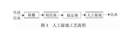 10、人工湿地:是利用人工水生态系统内多级生物的稀释降解作用来去除或削减水中污染物的方法。人工湿地作为一种新型生态污水处理技术具有投资和运行费用低、抗冲击负荷能力强、处理效果稳定、出水水质好、水生植物有一定经济价值等诸多优点。用于农村生活污水处理的主要是潜流人工湿地。人工湿地处理工艺流程图见图3。