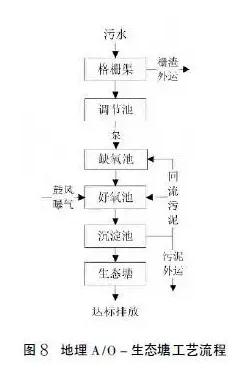 该技术适用于拥有自然池塘或闲置沟渠,地势条件易于收集污水,并能通过自流出水的且规模适中的村庄,处理规模20~200t/天。工艺参数:缺氧池停留时间不小于4h,好氧池停留时间不小于6h,生态塘停留时间不小于24h,污泥清理周期180天,工艺流程见图8。