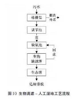 本技术适用于处理要求一般,规模较小,距离居民区较远的污水处理设施,处理规模10~30吨/天。工艺参数:集水池停留时间不小于12h,缺氧池停留时间不小于12h,生物滤塔负荷0.2~0.3m³/(㎡˙d),人工湿地水力负荷0.5~1.0/(m2˙d),污泥理周期180天,工艺流程见图10。